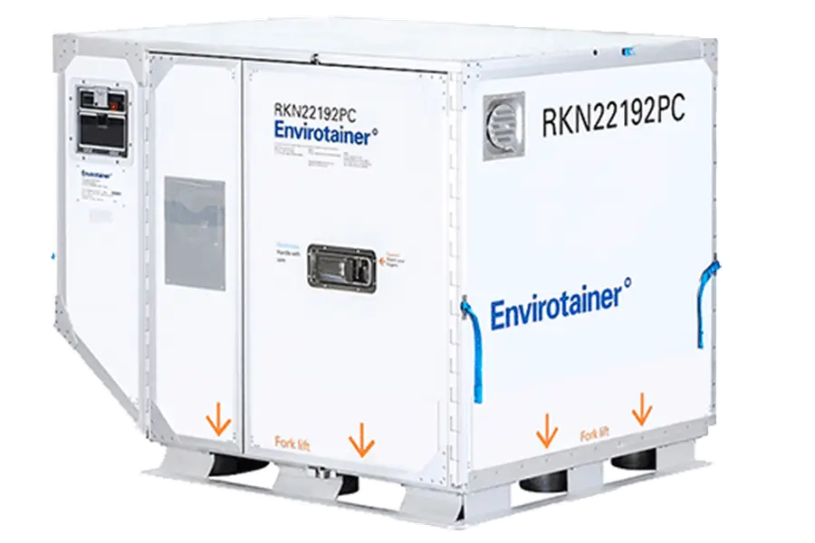 Your frozen food will be stored in an Envirotainer RKN t2, a pallet-size container that's cooled via dry ice. For smaller shipments, you can share the space with other shipments. But for larger orders, you can rent an entire Envirotainer, earning you a bulk discount. For reference, it's 2.93 cubic meters in size.